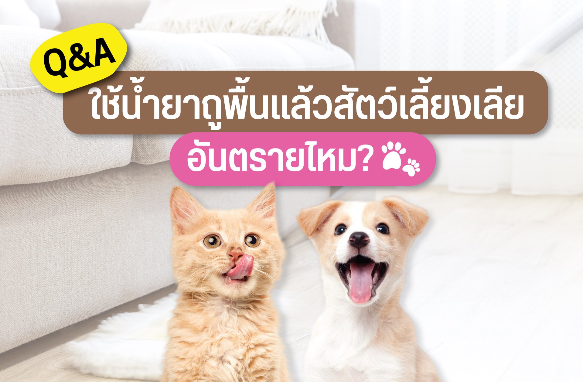 ในการทำความสะอาดบ้านคงหนีไม่พ้นการใช้น้ำยาทำความสะอาดต่างๆ เช็ดหรือถูไปบนพื้นผิว ไม่ว่าจะเป็นสิ่งของเครื่องใช้ และพื้น ถ้าหากบ้านของคุณมีสัตว์เลี้ยง บางครั้งน้องอาจเลียพื้นที่เราทำความสะอาดไว้ หรือเลียขนมที่อยู่บนพื้น ทำให้เจ้าของมีความกังวลว่าจะเป็นอันตรายต่อสัตว์เลี้ยงหรือไม่ คำถามยอดฮิตที่มักถูกถามเข้ามาบ่อยครั้ง วันนี้ขอมาไขความกระจ่างค่ะ