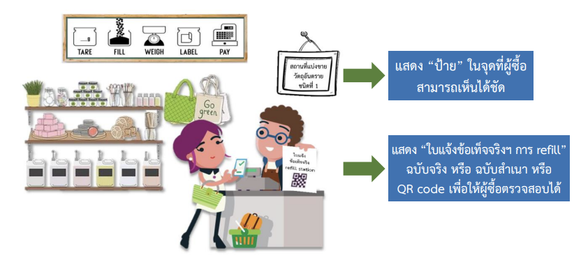 โดยจุดบริการแบ่งขายสามารถเป็นได้ทั้งแบบสถานที่ หรือแบบเคลื่อนที่ได้โดยใช้รถยนต์เป็นพาหนะ ซึ่งต้องมีการแสดงป้าย สถานที่แบ่งขายวัตถุอันตรายชนิดที่ 1ในตำแหน่งที่เห็นได้ชัดเจน และแสดง ใบแจ้งข้อเท็จจริงฯ การ refillฉบับจริง หรือ ฉบับสำเนา ในรูปแบบ QR code หรือ url ที่สามารถดาวน์โหลดเอกสารได้ เพื่อให้ผู้ซื้อตรวจสอบได้